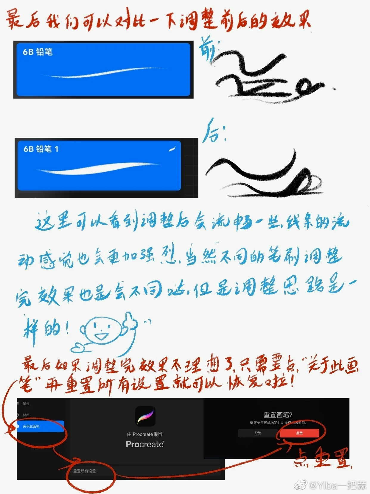 这些方法呢是比较适合一些常规笔刷的调整,不同的笔刷调整出来的效果也是会有一些出入的,建议大家前期可以多做一些尝试,当然如果你最后调整之后效果不理想也是可以补救滴,只需要在我们画笔工作室的最后一个选项关于此画笔这里点击重置所有设置,这样就又恢复到最开始的笔刷设置了。以上就是我总结的关于笔刷使用不顺手怎么调整的一些方法和思路分享啦~大家在实际操作中有任何问题也可以评论区留言哦~”