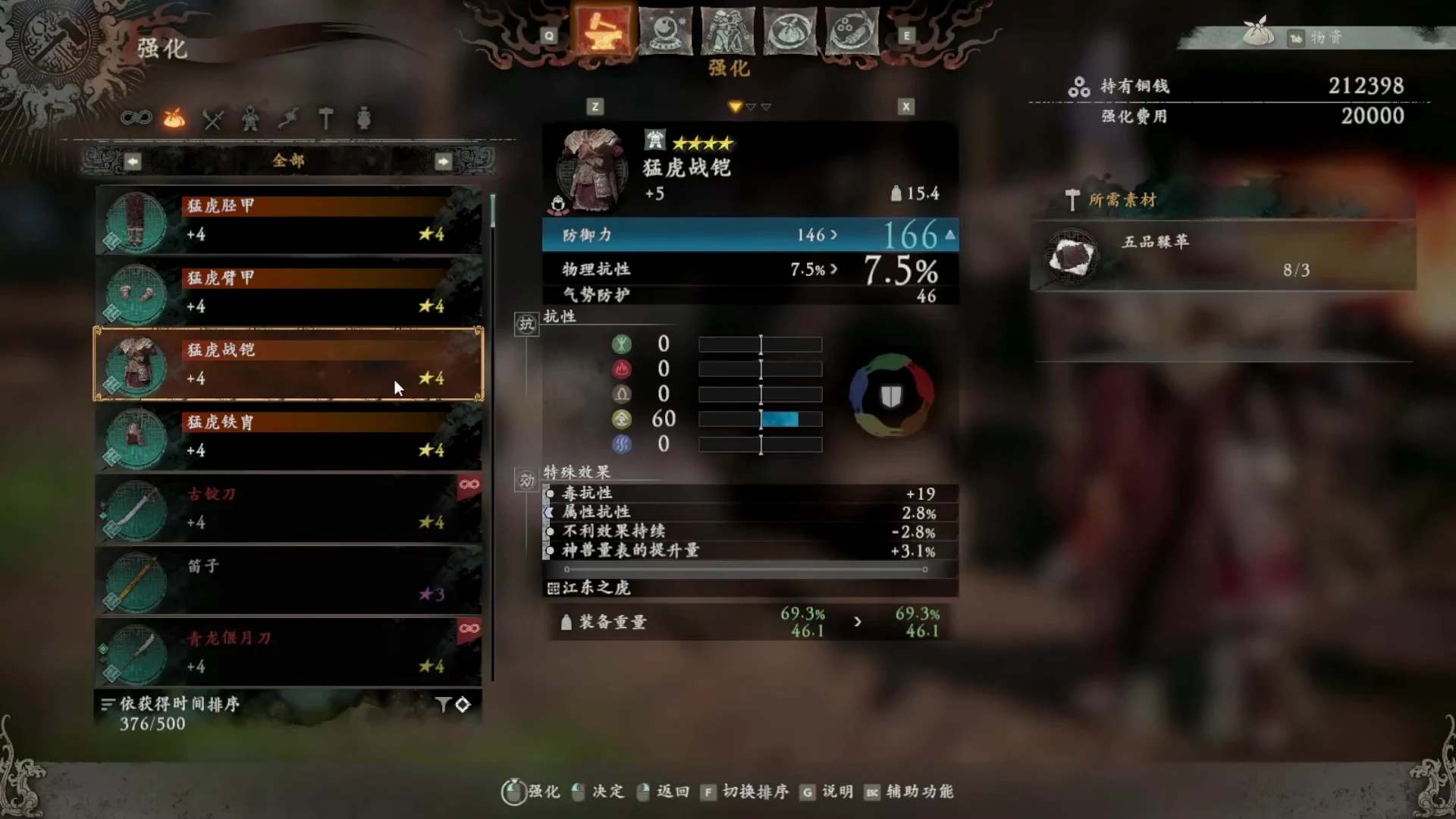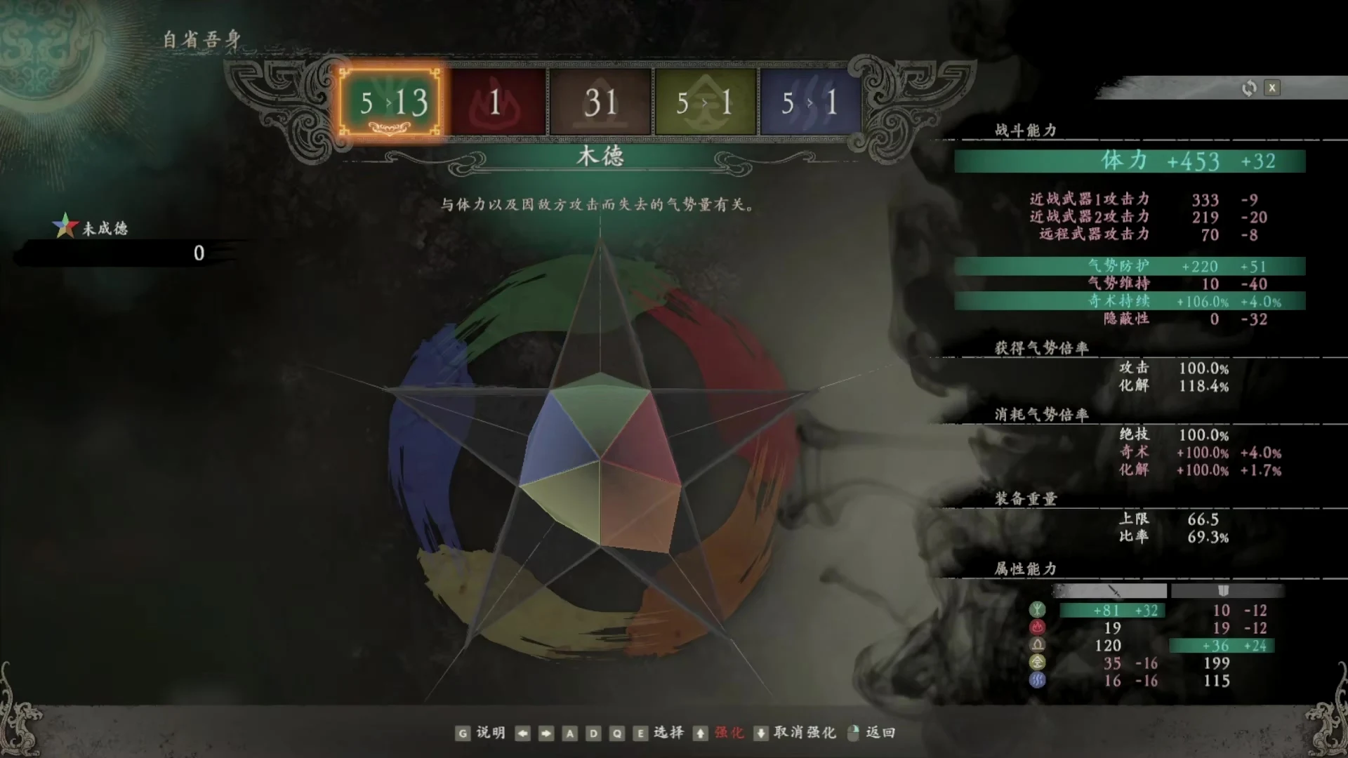 五行相克很有中国味,但是收益完全不如化劲红光。加点基本就是为了装备重量和能放一些奇术。