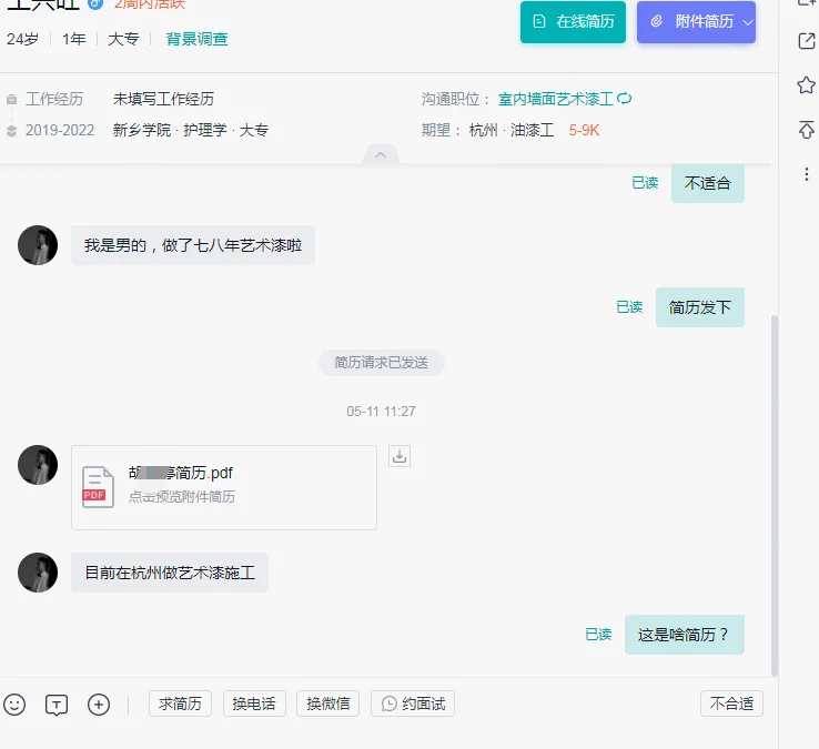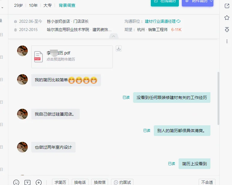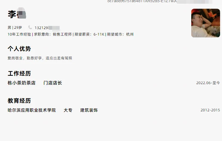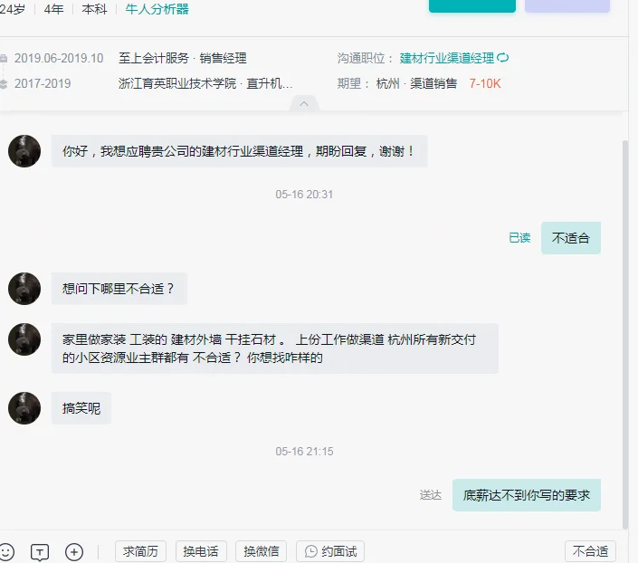 图4:个人简介就只有到19年的工作经历,做的会计公司的销售,专业是直升飞机驾驶员,3年学年应该是专科,简介写了个本科,这些跟我招的建材渠道没有任何关系,简介还没写近4年工作。我挂这岗位一般都是考虑三四十岁,有很多资源和资历的那种,二十多岁的基本很少接触,结果被对方嘲讽。实际上我们做的渠道是设计师渠道,不是小区业主,唉,可以想象这种人即使面试的时候也能吵起来,回避吧,太年轻了,我实在没这个耐心解释那么多。