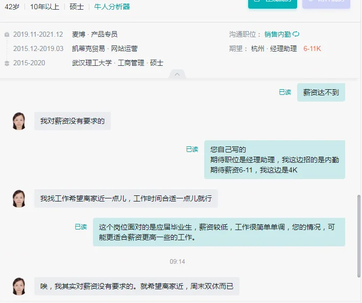 图1:挂了一个内勤岗位,薪资也就4-5K,基本没啥难度压力,女孩子心细有责任心就行。结果好多高学历的来咨询,像这种学历的,很少有能做下去的,硕士学历拿着4000多底薪,还要扣社保等,年龄又不小了,呆不了多久的。虽然胜任力绝对是降维打击,但是对于招聘对象的稳定性考虑,还是没办法。