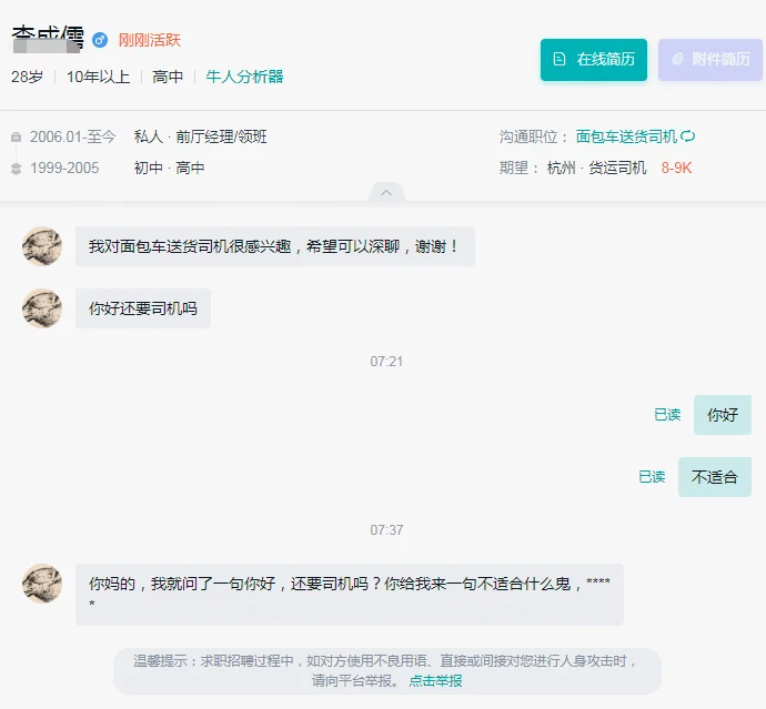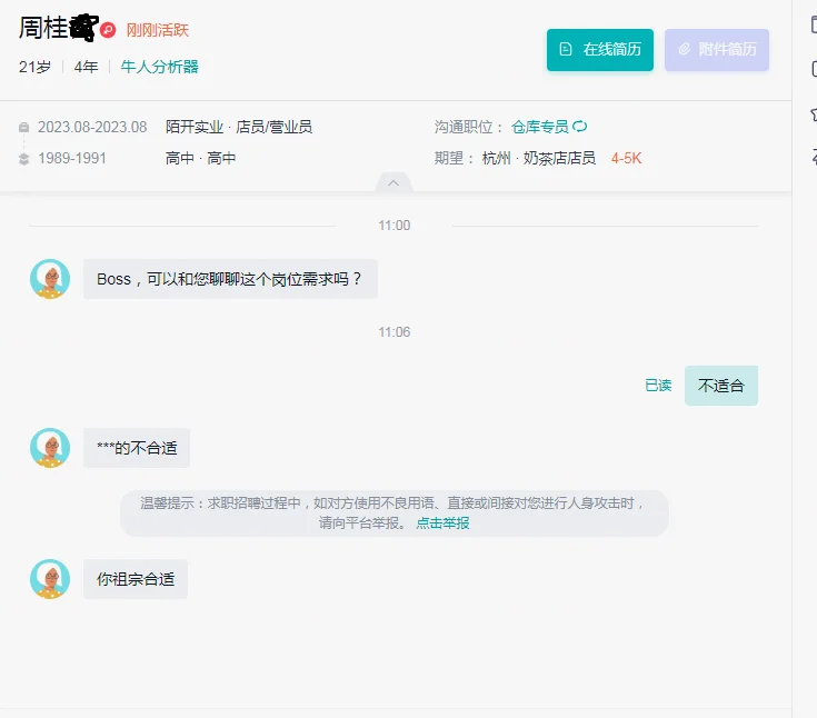 图2-3:稍微挂一下,口吐莲花型求职者。图2个人简介根本没有任职过司机的介绍,直接拒绝;图3也是一样,21岁工作4年只有一个不足一个月的营业员工作经历介绍,个人简介都这么随意,估计人也不怎么仔细,再说我这个招的仓管要搬运水泥的,不适合女性。被骂之后就举报就行了,有趣的是举报完对方还能知道是我举报的,又发来嘲讽的留言,因为拉黑了没有聊天记录,所以也没有截图,就很神奇。