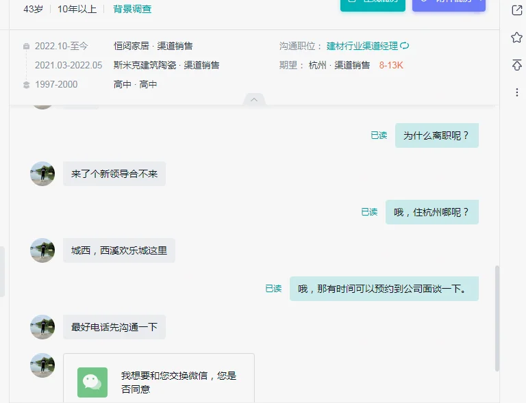 图9:做招聘久了,多少都有点职业敏感度,这人跟我在线交流时候我突然问了句离职理由,其实这个问题面谈时候问也可以,这次不知道为啥我就是要提前问一下。对方回答说新领导性格不合。这里有个小知识点,离职理由是HR必问的问题,跟前领导性格不合是比较低情商的回答,暴露了你个人的问题,因为一般情况,能力比你弱还能当你领导的情况不多,所以大多数可能是你个性或者能力有问题,你引起了HR的警觉后,HR会针对性的再次测试验证判断。结合这个人工作经历更换比较频繁,间隔时间也不长,我大概觉得这个人确实个性不太好至少从吐槽前任领导来看情商也不行,所以团队融合或者不太行,虽然一直在建材行业,但是品类没有坚持专精,个人规划也不太理想。