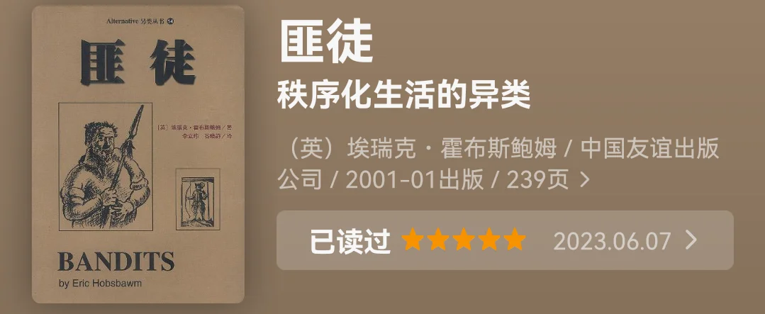 前两天刚把这本读完新文章就马不停蹄的写出来了,其实在构思明智吾郎分析这篇文章的时候我一直想要尽可能的从普罗普叙事学角度做切入,所以选择了《故事形态学》做打底,霍布斯鲍姆老师的这本《匪徒》虽然放到现在来看还是有不少观点过时了,但霍布斯鲍姆作为马克思主义史学家,其治史立场没问题,笔者自己读完了也觉得挺棒的就给了五星评价