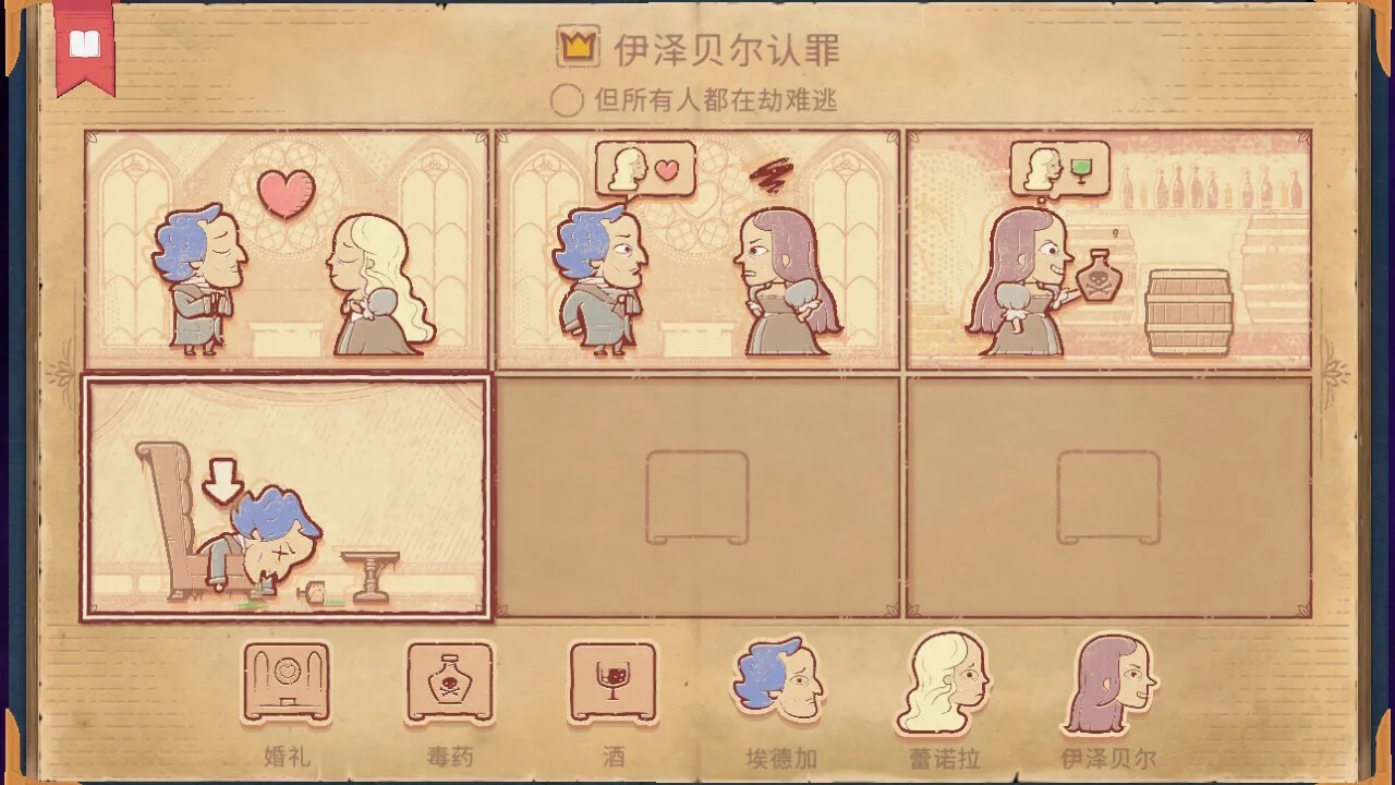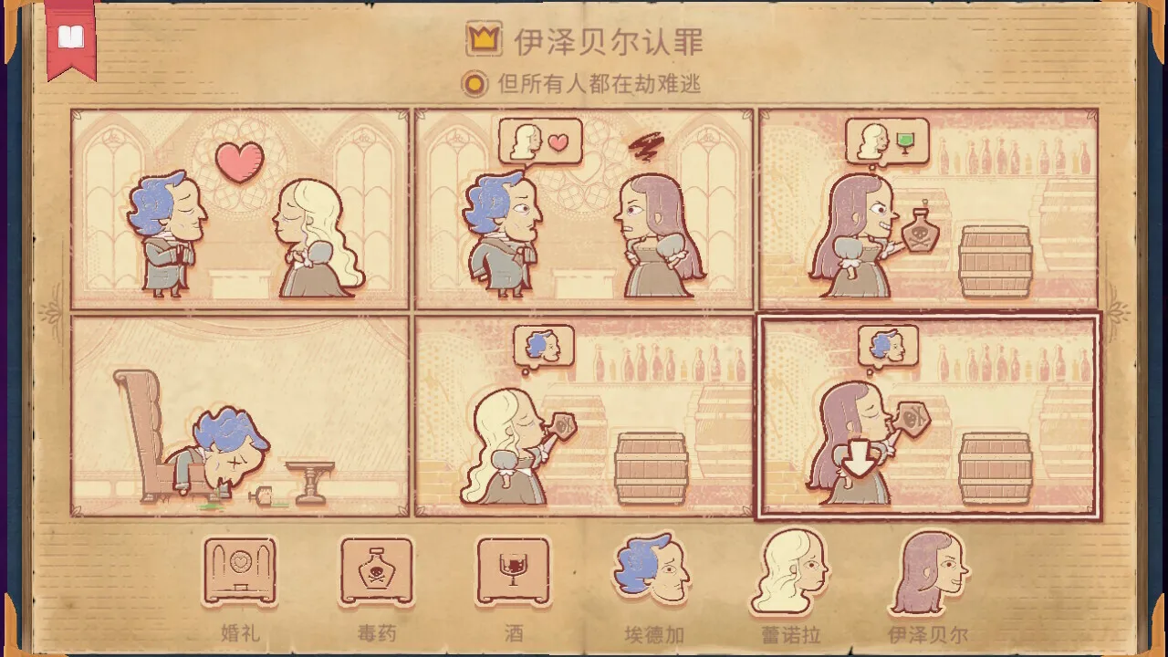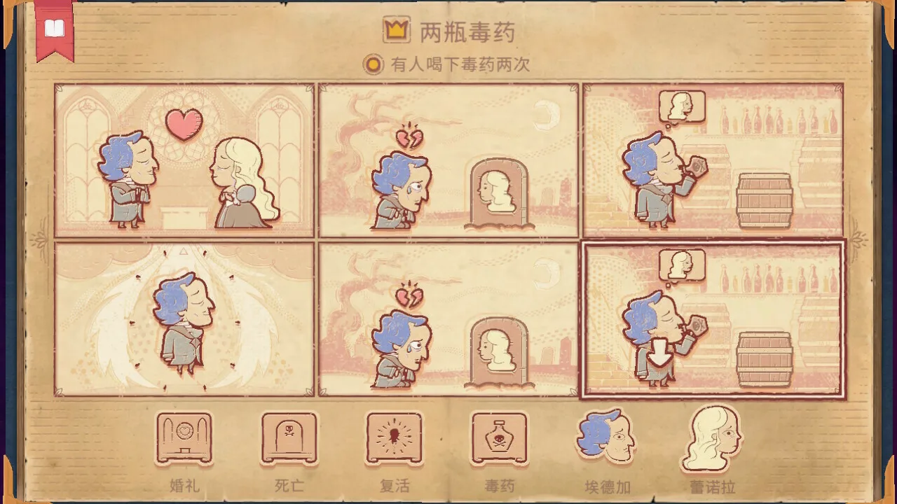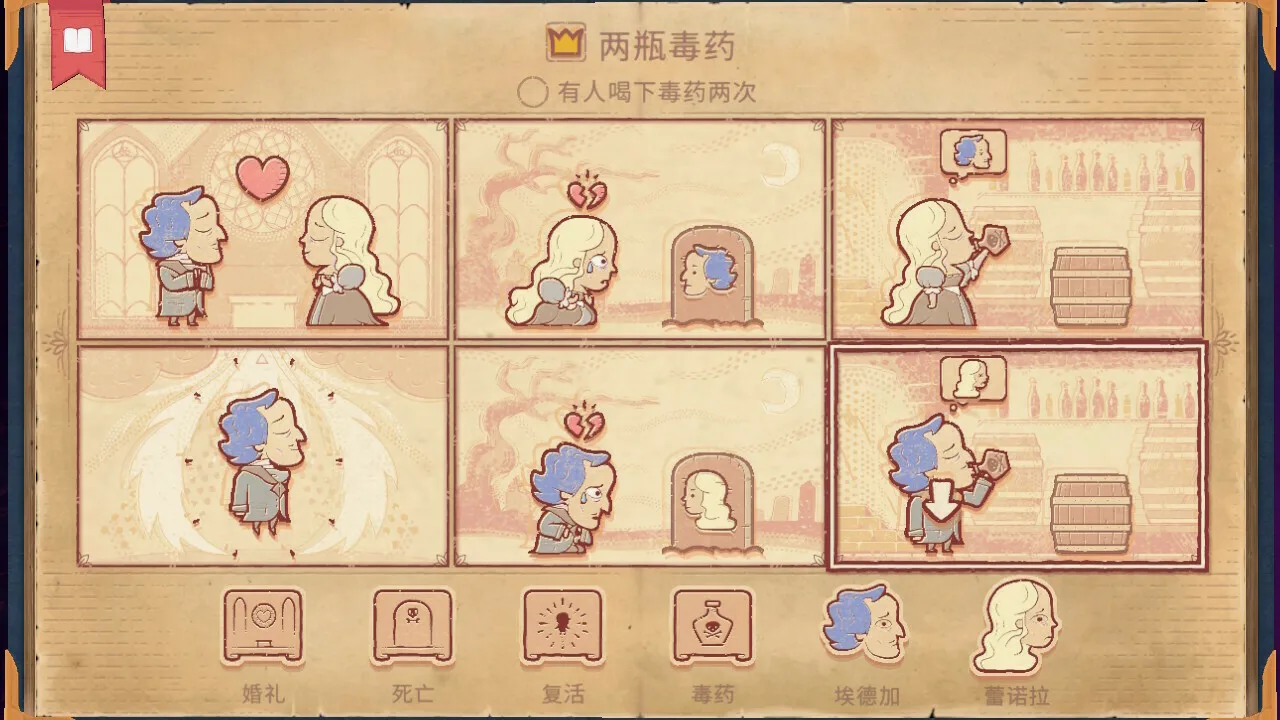 以《两瓶毒药》这个关卡为例,玩家需要在婚礼、死亡、复活、毒药四个场景,以及一男一女两位角色当中进行搭配。