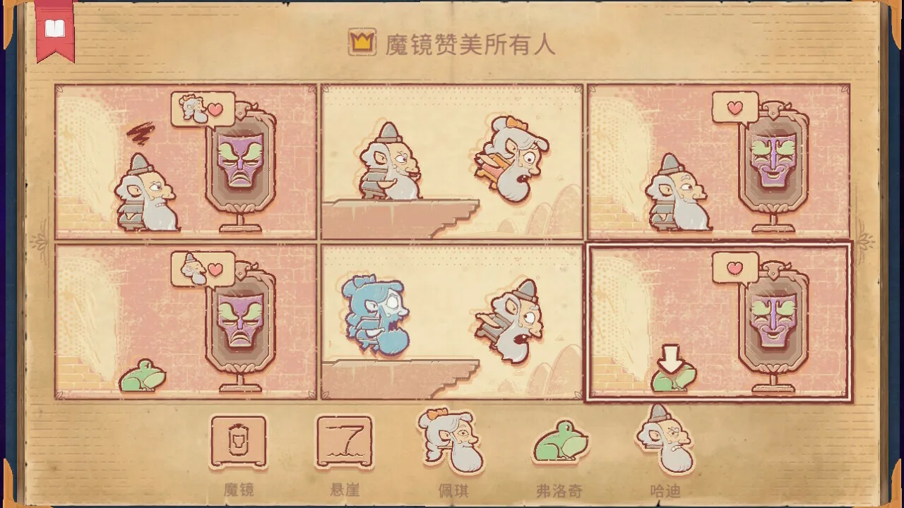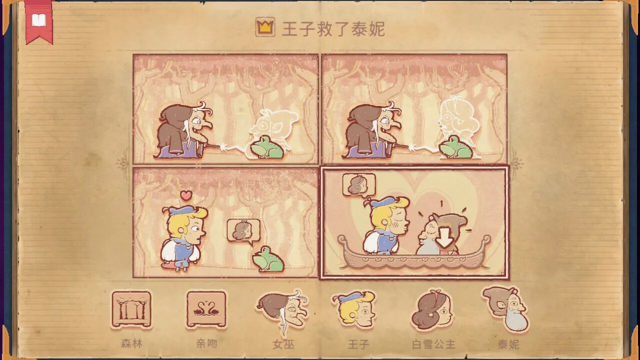 也正因为是绘本的形式,场景、人物以及拼贴顺序的搭配又让游戏有了一定的延展性,本质上把人物关系捋顺就能过关,而达成这些人物关系的画面最终拼成了什么样的故事,则完全由屏幕外的你来品味。游戏里某些关卡还有额外破关条件,引导你尝试更多的解法,炮制更有韵味的故事。