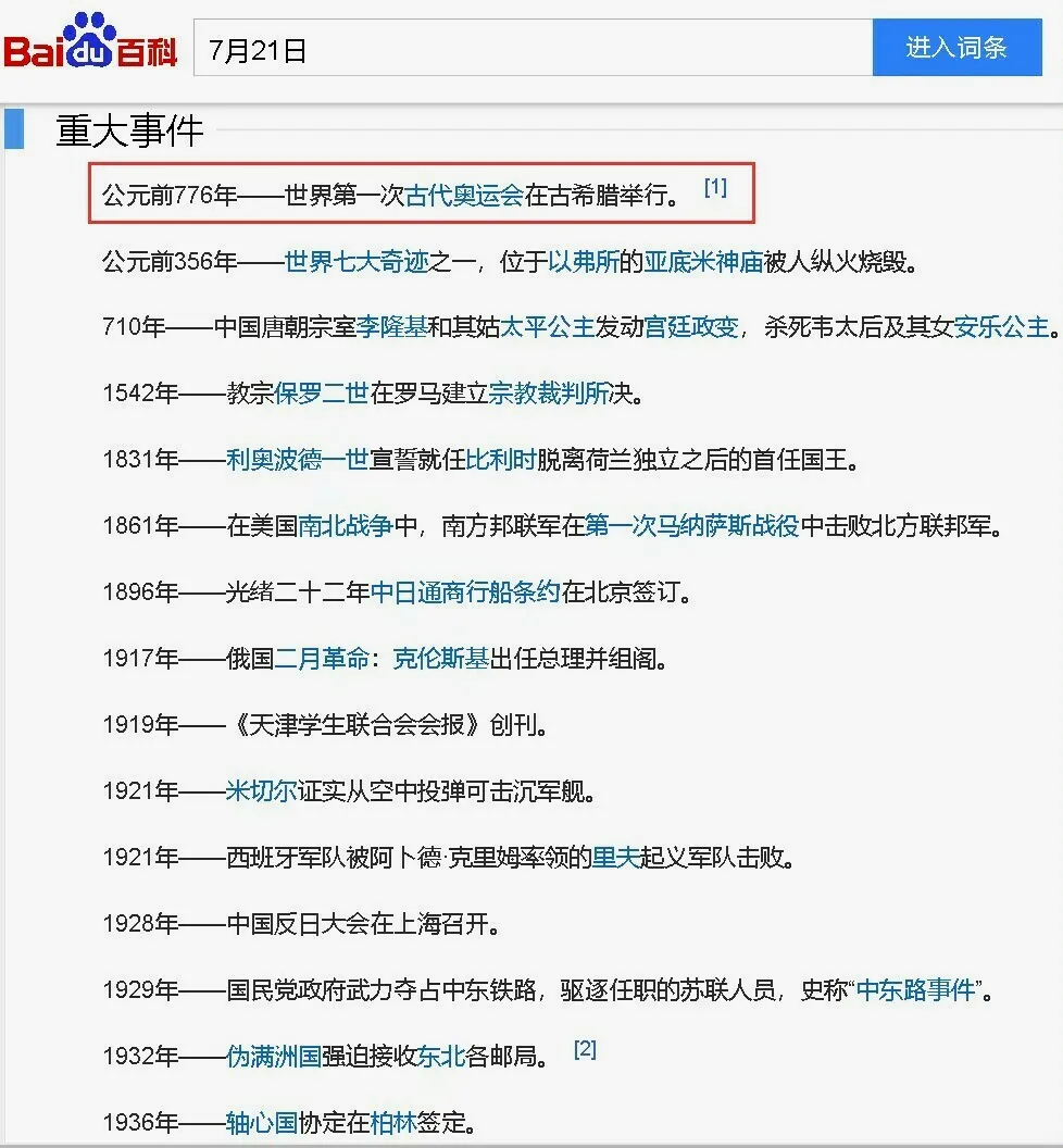 1:【公元前776年07月21日】————世界第一次古代奥运会在古希腊举行。