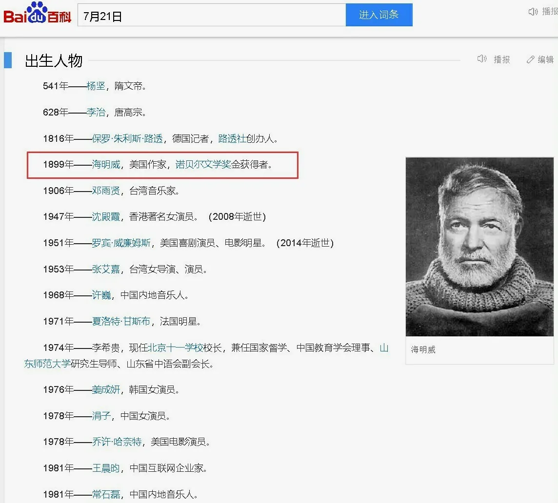 3:【1899年07月21日】——海明威,美国作家,诺贝尔文学奖金获得者。