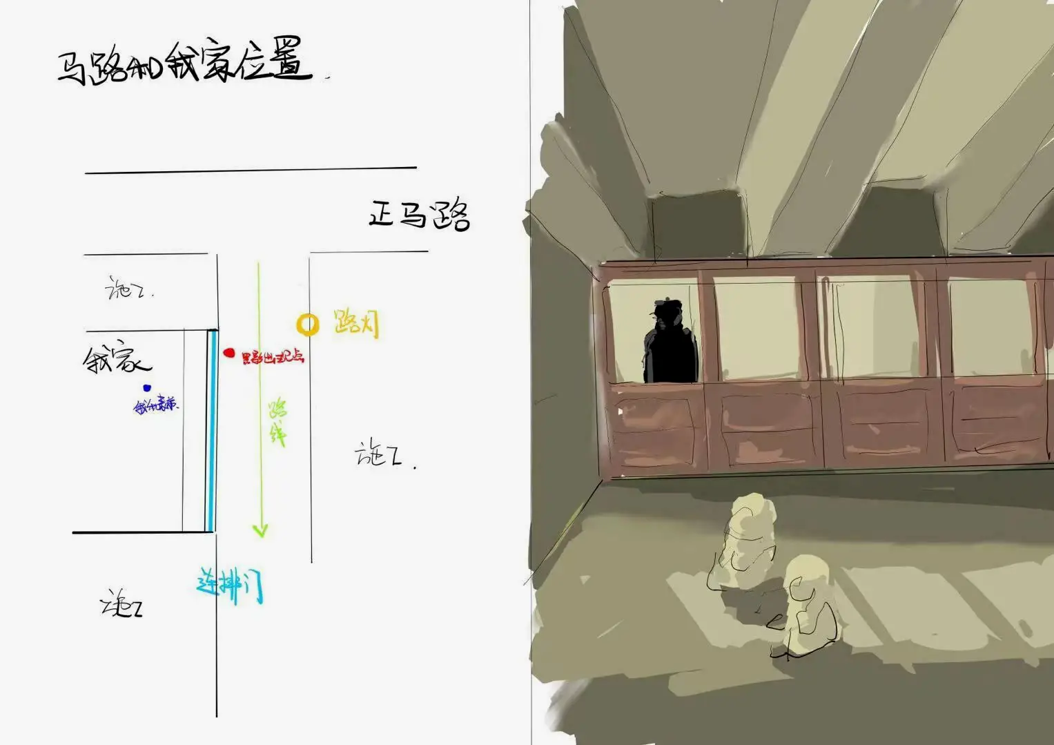 故事发生在我小时候一个家庭聚会的日子,可能也是祭祖一类的日子,因为当时街上没啥人,一般不是过年就是清明一类的日子比较冷清,家里是我爸的姐姐和妹妹三家人比较亲近,逢年过节会一起聚一聚,吃饭到快结束的时候天已经黑了,路灯有光照进一楼看的比较清楚所以也只开了饭桌那边的一盏灯,我和我表弟还有我表姐吃饭比较快就都离席了,我表姐岁数大点就到二楼去看电视了,我和表弟在靠门边玩玩具,小时候地上打滚都是常事嘛,就都坐在门边不远地上,我是背对着门,靠外面路灯的光玩玩具看的比较清楚,玩着玩着突然我表弟指着头两个门板那边说怎么有个叔叔一直在站外面看着我们,我转头看过去,在头两扇门那个毛玻璃那,路灯衬出一个黑色高大的身影,小时候对身高的概念不那么准确,但是那个影子的轮廓看着怎么都有一米八了,在南方其实不多见,像是一个带着风帽穿大衣的男人,因为肩宽比较宽而且手臂之间没有透光,因为我距离门边其实不远人影的轮廓算不上脸贴在玻璃那种特别清晰的轮廓但是也不是那种糊的,还是能辨别出绝对是人的样子不是路灯上飞虫一类的遮光怎么样的,可能距门大概有个一两个身位,起先我俩没当回事觉得可能是有人在外面等人怎么样的,但是玩了会再看那个人影还在那站着,而且不对劲的是他纹丝不动,如果是有人在外面等人一类的,不可能一点动作没有,就是和稻草人一样完全没有一点动作,可能有个几分钟时间,我就和我弟弟讲我俩去看看,俩小孩啥也不懂也没鬼神一类的概念也不知道怕,我当时还寻思万一是认识的叔叔还能打个招呼进来和家里人吃饭聊天,但是当我俩往那走的时候那个影子就开始有反应了,先是向着一个方向垂直侧了一下,像是那种立牌人一样,特别僵硬整个侧了大概十度左右,有点像是要跑又有点像是侧身在往屋里看那种,因为头的影子黑了一点身体淡了一点点,然后我俩就快步往那走,结果那个黑影平移一样到了右边,很反常的那种平移,像是有轨道在下面一样,速度和走路差不多,我和我弟弟就一叫唤往那跑(小孩嘛都爱瞎叫唤),其实我们到门边可能也就几秒钟不到时间,结果那个影子嗖的一下瞬间就从那一排门板的距离穿过去了,那速度都快赶上汽车了,而且影子形变程度不高,说明一直贴着门没多远不是在路灯那边,我和我弟弟开门门跑出去,什么都没有,摩托车汽车或者人影什么都没有,我家那个自建房边上还没建完也没有别的人家里开门进去,路是直线的,一眼看过去一个人也没有,我还在寻思怎么回事就突然不见了的时候就听到我表姐在二楼一声尖叫,我和我表弟赶紧一下窜到二楼去了,也还有大人一起,因为不知道发生什么了我姑姑还有我妈都跟着很快就上了楼,但是楼上的锁头从外面反锁了,那种老式门锁是里面有反锁的扣,但是外面拿钥匙反锁了里面也打不开的,我姐姐在里面拍门说他里面打不开门了,听声音都快吓哭了,我爸拿钥匙上来开了门问怎么回事,我表姐说他开着门看电视呢,因为二楼门就在电视旁边没多远,沙发也是对着门和电视的,所以看过去就两个都在视野里,她说光线不好但是看见有个人影在门口站着,他一开始以为是我爸还喊了声舅舅,结果突然和风刮过来一样那个门猛一闭给关上了,很大一声给他吓一跳就叫出来了,然后过来开门怎么也打不开,其实但是我看大人脸色也有点慌,但是还是安慰说应该是风带关了门别怕别怕什么的,但是其实我们都知道那门从外面反锁了,还是我爸拿钥匙才打开的,没人在外面关门怎么可能从外面反锁上呢。这个确实是真事而且我和我表弟还聊过好几次,对那个影子的描述也都是一样的,都给人一种闷实的感觉,正常人影按道理应该是虚的感觉,不过也不知道是不是灵异事件,说不定是第三类接触呢哈哈哈哈,描述的不太好,我配个图说明一下