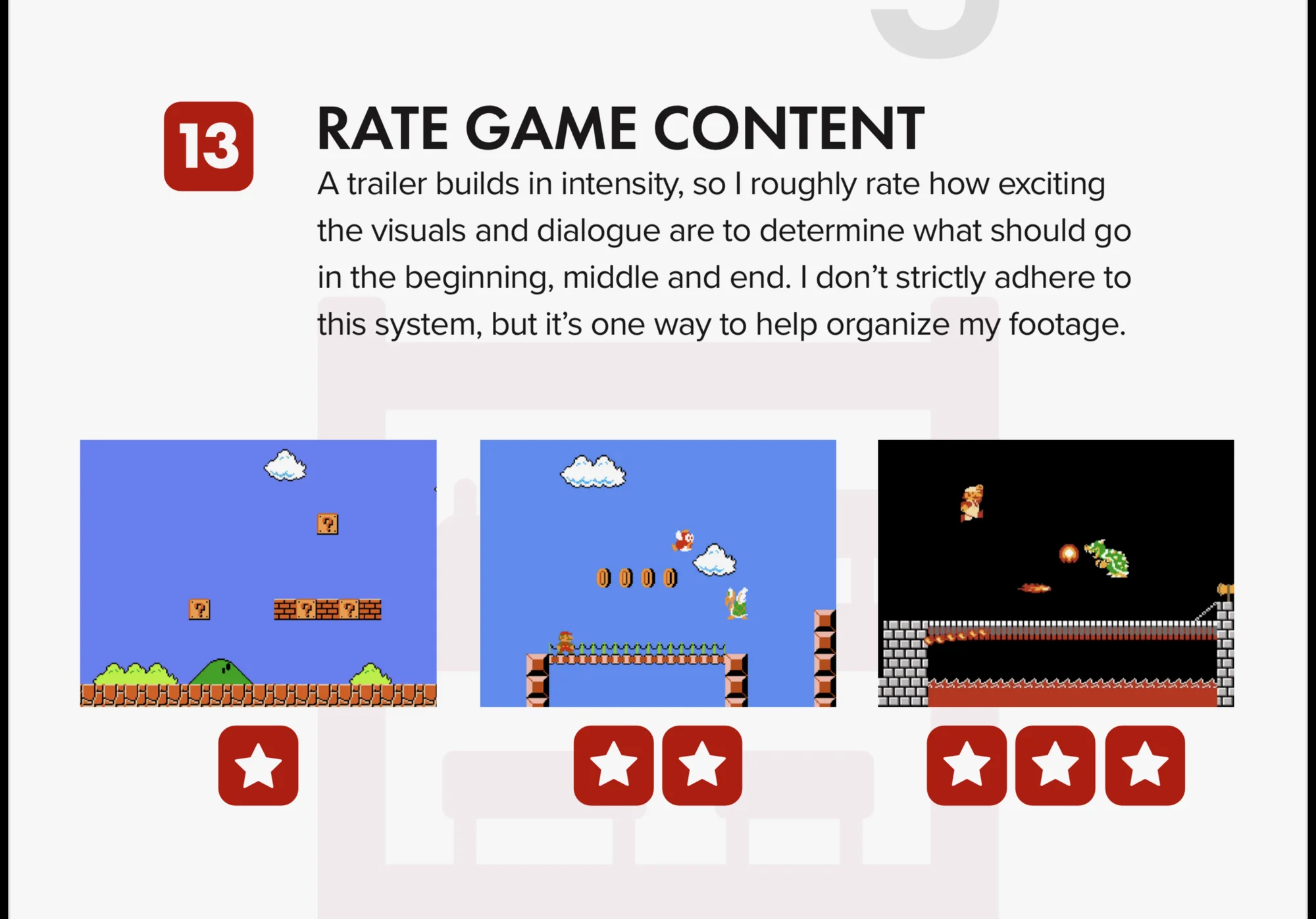 这套方法并非我完全原创,而是受到了资深宣传片制作人 Derek Lieu 的启发,他在宣传片教程中有提到,制作宣传片时,可以先对手头的素材强度打分,再参考宣传片常用的节奏分布来编排(最后一张图,来自 Derek 的电子手册 The Game Trailer Checklist)。