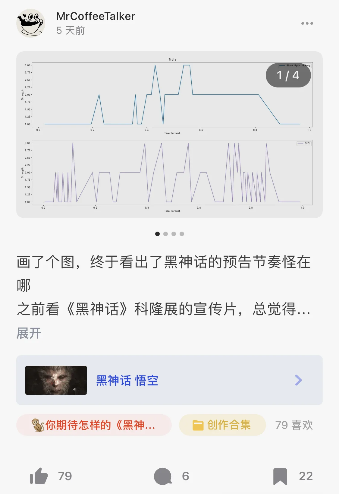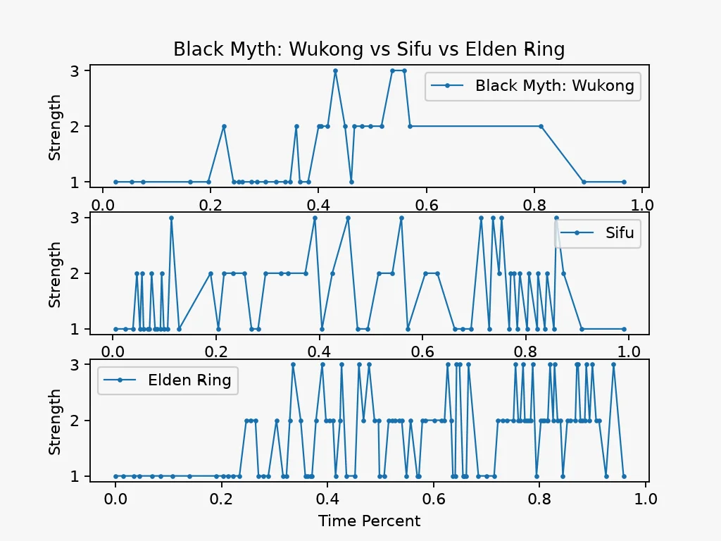 前几天分享了几条关于《黑神话》宣传片的分析,为了分析节奏塑造上存在的问题,我用折线图对比《黑神话》与《师父》、《艾尔登法环》的宣传片,引起了一些朋友的好奇、问我是怎么做的。