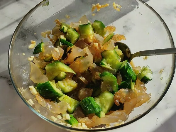我的脑子:家里聚餐,上了一道凉菜大蒜海蜇皮拌黄瓜~
