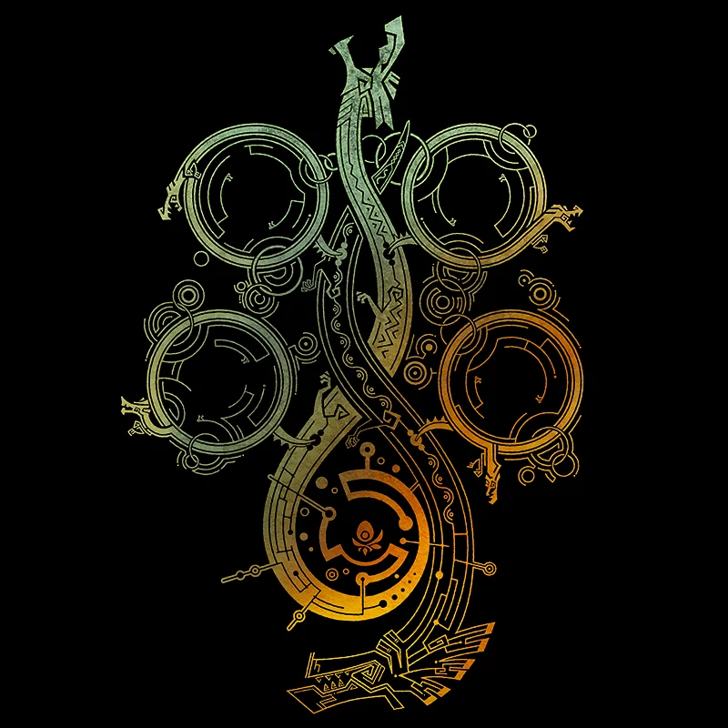 两条首尾交错的龙,有可能指的是玩家和某只一路对抗的古龙(参考灭尽龙与苍蓝星),因为有一条龙的尾部有个类似篝火的图形(也有点像动物的卵或者植物的花凋谢后出现的果实/种子),这条龙像是从篝火里出现的,这也符合目前社区普遍推测的玩家自行扎营的玩法,两条龙也符合双武器出行的设定。