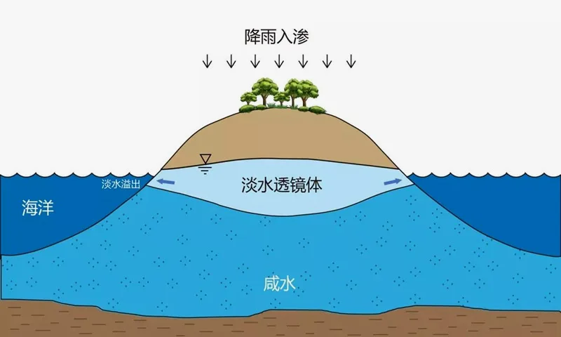海洋里一些较大的珊瑚或石灰岩岛屿下面可能会有一层凸透镜形状的淡水层,被称为“淡水透镜体”(Freshwater lens)。
