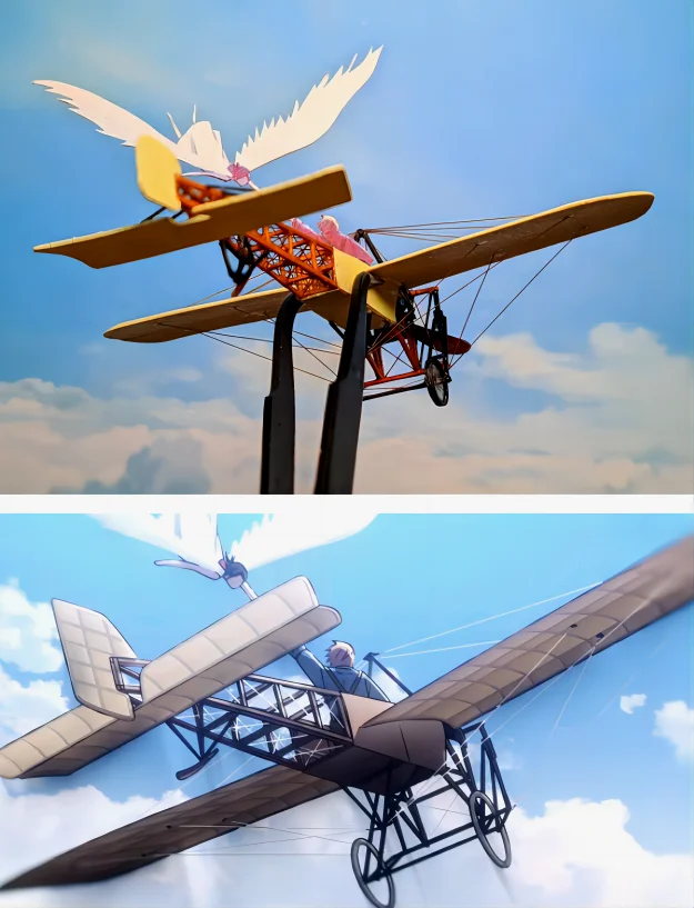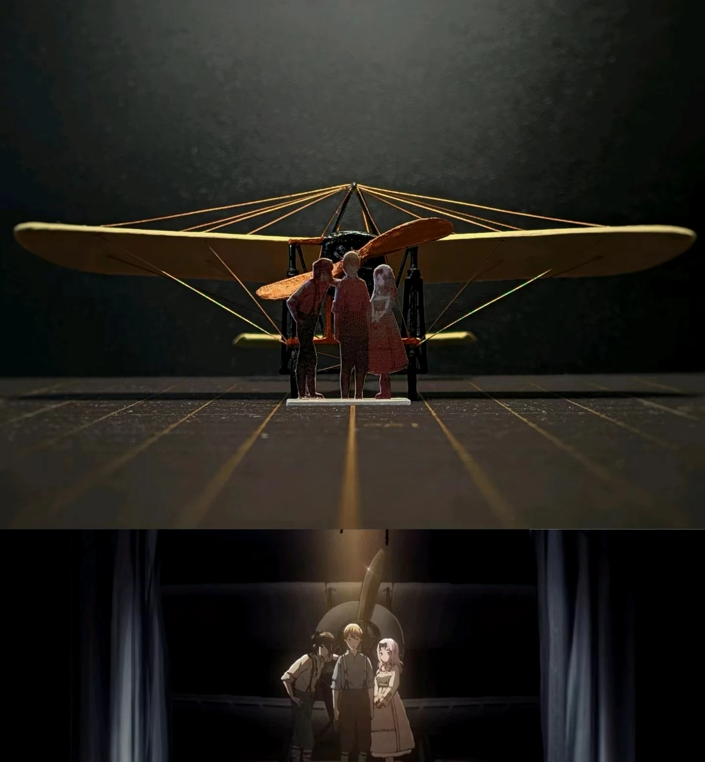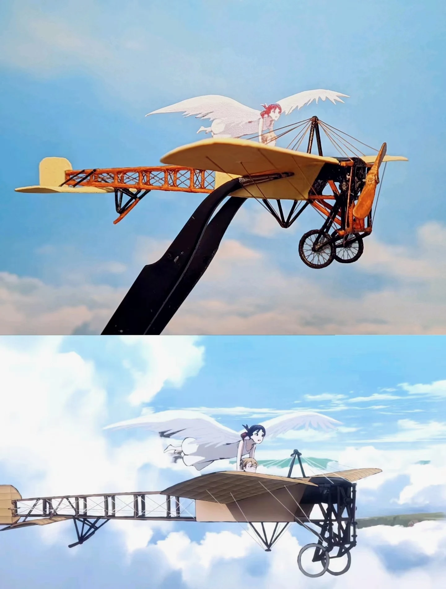 当然,去年完结的不只是《辉夜》的漫画,A1操刀的《辉夜》动画第三季同样于去年完结。与漫画相反的是,A1一丝不苟地还原了赤坂曾经还在乎他笔下人物和故事时创造的高光时刻的同时,又以自己的理解对这段令人如沐春风的旅途增添了不少属于A1自己的二次创作,足够让我“抛开漫画后面的降智操作不谈”。在令人目不暇接的动画化二次创作中,令我印象最为深刻的就是全三季中A1对古早飞行器的忠实描绘。从纽波特10式到索普维斯“幼犬”和“鹬”,从福克D.VII到朗普勒“鸽”式,这些短暂出场、对剧情并无半点影响的飞行器的刻画之准确、细节之丰富,让作为老式飞行器爱好者的我看得又惊又喜,要知道,就连宫崎骏作品中的同时代飞行器有时都会有细节上的些许错误。而这些于《辉夜》动画里的飞行器相关片段中,最令我难忘的便是第一季ED里,辉夜用李氏步枪的刺刀斩断象征四宫家庭桎梏的齐柏林飞艇蒙皮,自其上一跃而下时,一架机身桁架和张线暴露在外的米黄色单翼机翩翩而上,坐在驾驶舱里的白银伸出左手抓住辉夜的手,二人一起翱翔在云端的情景。
