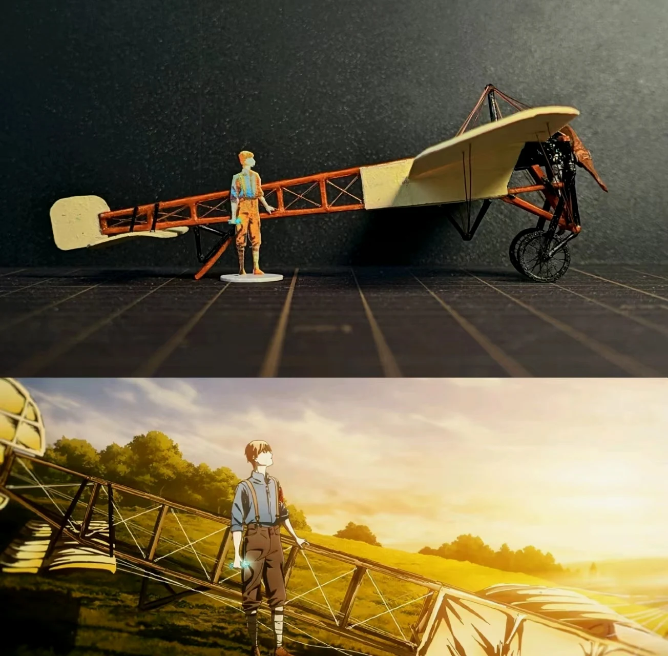 2018年的我在看到这个片段时,这架单翼机独特的外观特征让我很快就下定了结论——白银的座机是一架布莱里奥11型;且鉴于画面中土地神发动机样式的机鼻、起落架形式、机身顶部的三角形张线支柱和常规布局平尾等细节,都像极了布莱里奥11的后期生产型;不过在今年年初我终于准备着手制作一架时,在按我最初的判断,以后期型布莱里奥11为参考样本搜集资料时我才发现一些不对版的地方,如后起落橇和机身梁的布置等;起初我以为是A1的作画出现了错误或者A1生造了这些与真机不同的细节以让飞机的线条更加美观,然而翻阅不少图片后我才意识到我对型号的判定出现了错误。于是我查阅了布莱里奥11的变体名单后,才在名单的末尾翻查到了“图林A型”——历史上仅有二十几架出产的一种瑞典仿制型,各种细节终于和动画中的白银座机完全相符了。从确定型号的一瞬间,我才意识到A1辉夜制作组的细节刻画和考证是多么严谨。
