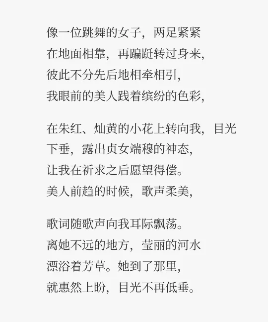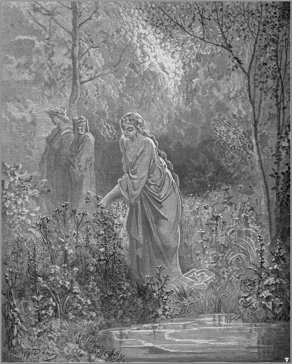 她说,原人亚当犯了错,被逐出了这地上乐园。这林中有两条河:勒特(Lethe)河(意为忘川)与欧诺埃(Eunoe)河(意为记忆善行之河)。要先喝下勒特河的河水,忘掉生前的一切罪行,再喝下欧诺埃河的河水,唤起生前善行的记忆。