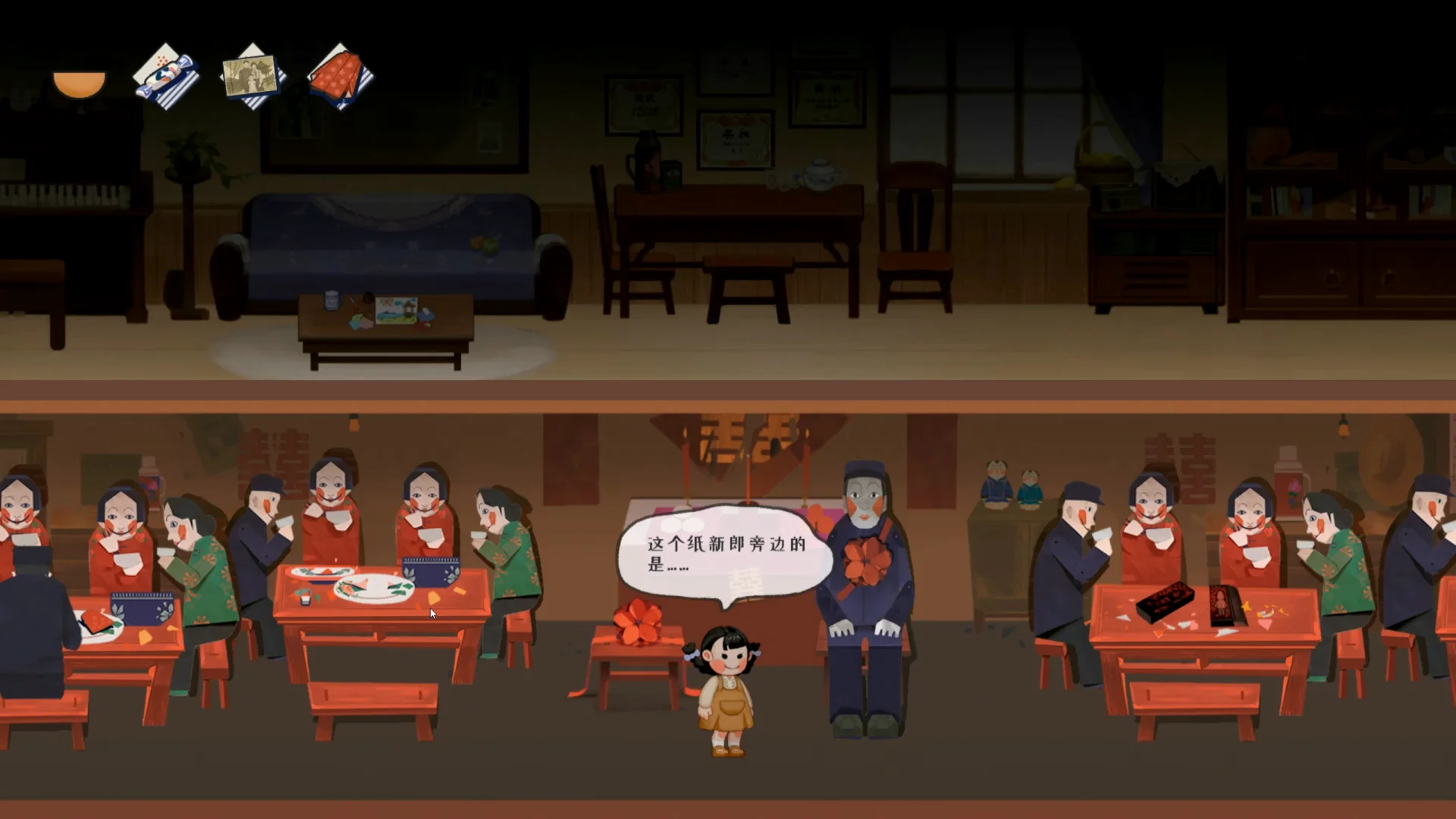 话说游戏本身,《喜丧》在我的感官里带有讽刺意味,倒和本作想传达的某些寓意还合上了。游戏以手绘风格,一个叫囡囡的幼孩视角参加奶奶的葬礼看到的事儿,揭示了奶奶的一生,游戏为轻度解密,游玩过程中重引导,流程还算顺利(在我游玩的时候,在中后篇幅的地方,因找不到线索卡过一段时间,但隔天作者就更新了游戏,把引导补上了)。