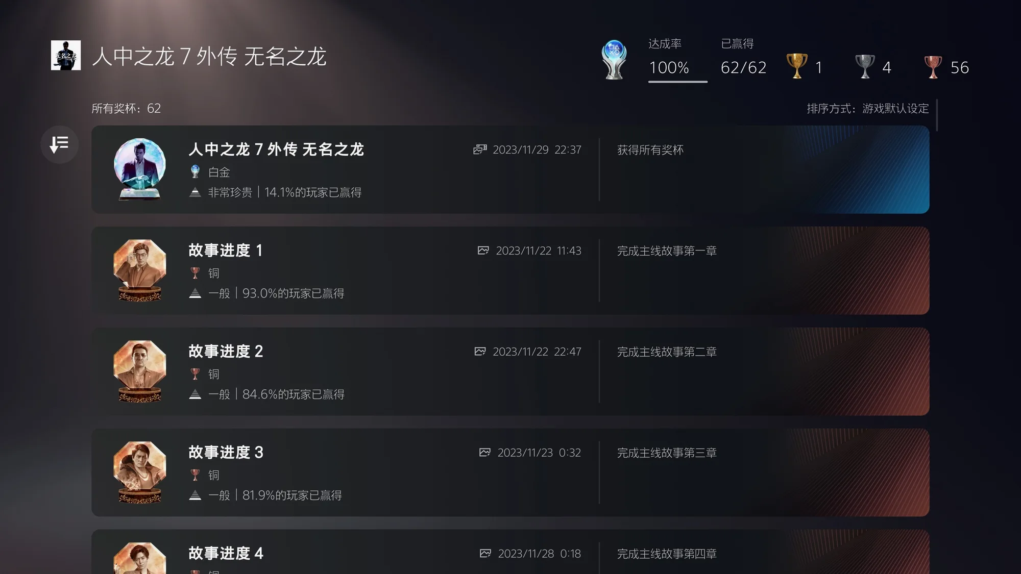 这应该是我玩过白金最容易的一作如龙了(前作几乎都是100小时以上),也侧向证明了如龙系列是真的出圈了,白金甚至都不要求二周目EX难度了。