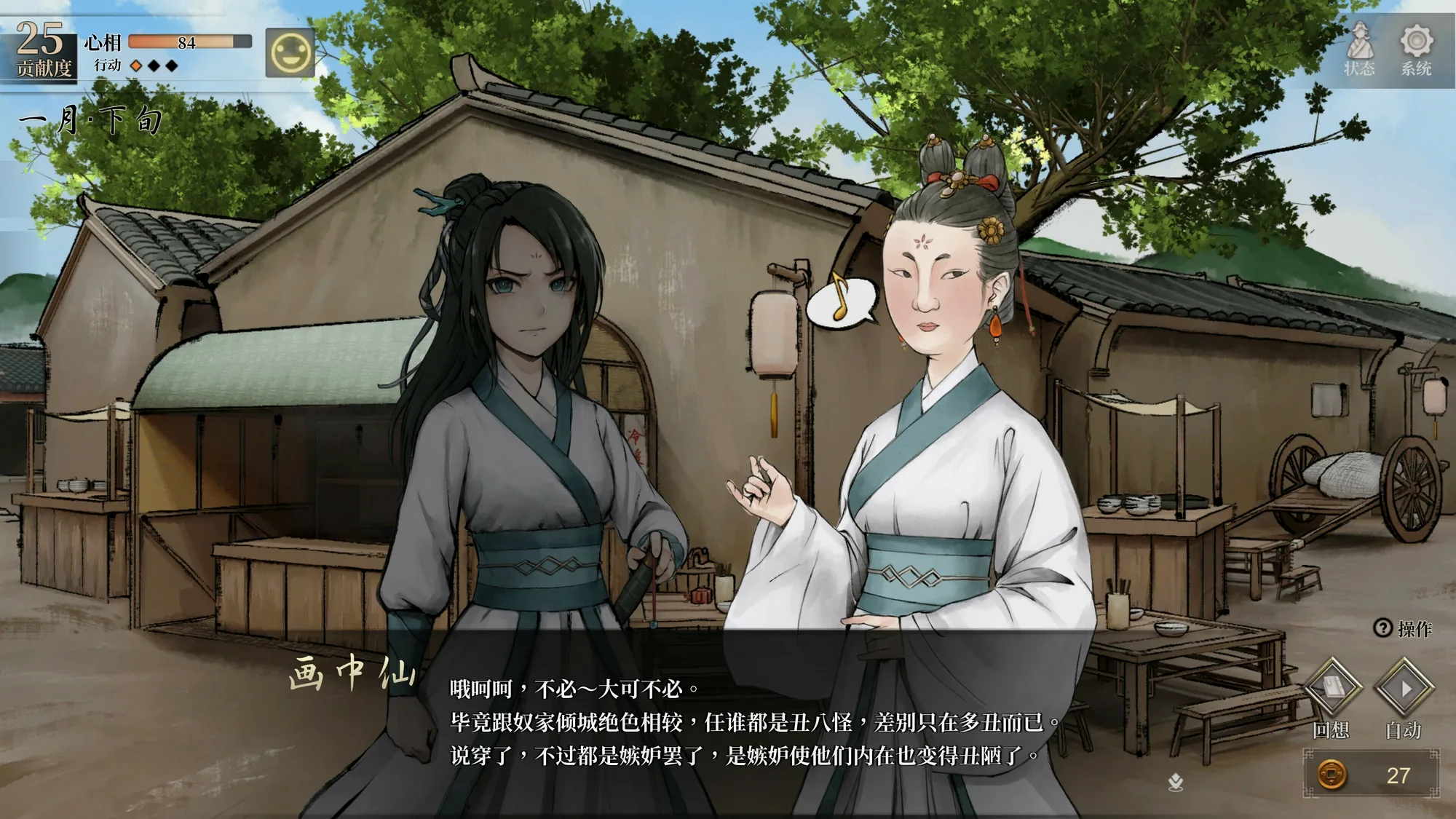 5个小时的体验下来,游戏机制相当粗浅,战斗系统简陋存档机制确实不够人性化。游戏的事件选择大部分都要靠投掷骰子来决定走向,一些选项甚至会直接导致游戏结束,但因为不能即时存档,一旦投出死亡事件要回到很早之前的存档处重新开始,这期间还有几个事件需要roll点,才能回到之前的事件,一旦再次roll点失败又要重新循环直到roll点成功。这也是前面让主播破防的点(他重来了大概五六次?)。我玩到第二年三月非战斗的roll点会死的事件只遇到过两个(包括上面说得那个点我没卡住一次就roll过了)。这毫无疑问是制作组考虑不周游戏欠缺打磨的地方。制作组也发公告说会改,但同时他们又说不建议一周目SL。因为这点他们被评论说 “教玩家玩游戏” 。在我玩了5个小时后,我其实多少能理解制作组不建议玩家在一周目SL的目的与想法。我意识到不能随意SL的存档机制与游戏的故事内容其实是自洽的,因为游戏的主角不是传统意义上丰神俊貌武艺高强的大侠,而是一个相貌猥琐实力低微的底边路人甲。主角实力低微到随便一个路人都可以拿捏主角。在猜拳式的简陋战斗系统下,一开始数值低微的主角在每一场战斗都可以轻易翻车,但战斗失败并不意味着游戏结束,游戏可以继续推进,失败会死亡的战斗往往防守顶个两三回合都有机制可以简单获胜。而且战斗前还是有自动存档的。我想制作组就是想通过制造玩家在玩这个游戏时不能随时SL的阻力来呼应丑陋弱小的主角在那个世界中举步维艰的处境,以此与达成自洽。听说制作组将随时存档功能放到了二周目,他们设想的一周目注定了是一种磕磕绊绊充满的遗憾的过程。假设如果玩家可以随时通过SL来达到想要的结果,那么这游戏无非就是一个以长得很丑的“龙傲天”为主角的普通武侠故事吧。