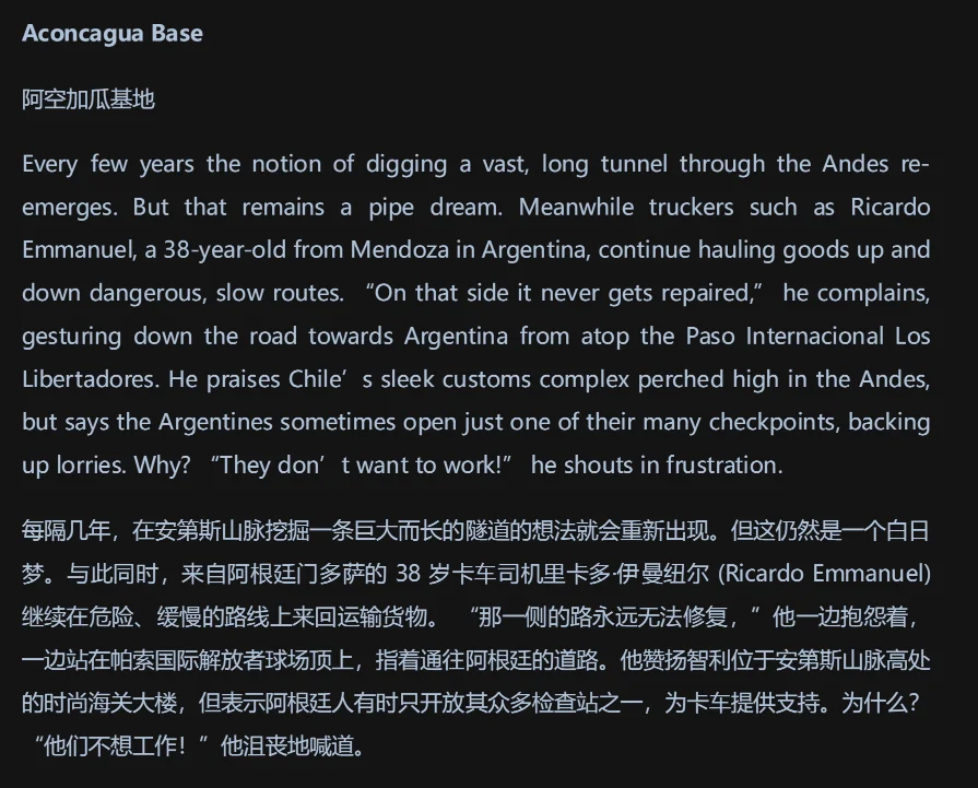 山脉、阻碍、金属、贸易、卡车司机!(中文翻译挺楞的大家见谅,机翻而已,大神自己读原文)这文章的每一个要素都像某种诡异的小红书茧房一样,这不就是“智利之夜”和“跨过文明与荒野的边界”想说的么!这场“屎的风暴”,根本就从来没有在南美停下来。。。