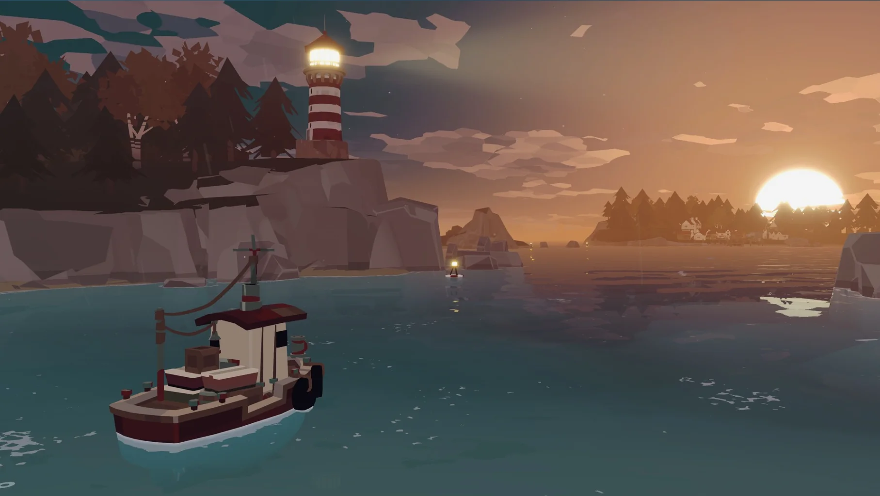首先《渔帆暗涌》的美术就让人眼前一亮,有几分《极乐迪斯科》那样的油画感,但整体的low-poly风格让作品看上去还是有点卡通化,对于渔船的造型细节也没有做过多刻画,即使你升级配件也不会在造型上有太多区分度。不过它的强悍之处在于氛围塑造,游戏内五个区域都有自己的地貌,并且作品引入了白天和黑夜的设计,如果说白天是舒缓悠闲的海洋垂钓,那么到了晚上则是刺激神秘的海洋征服战,《渔帆暗涌》通过环境和音乐的不同塑造为玩家带来了极强的氛围感,轻松引导玩家在不同时刻都能进入相应的心境。
