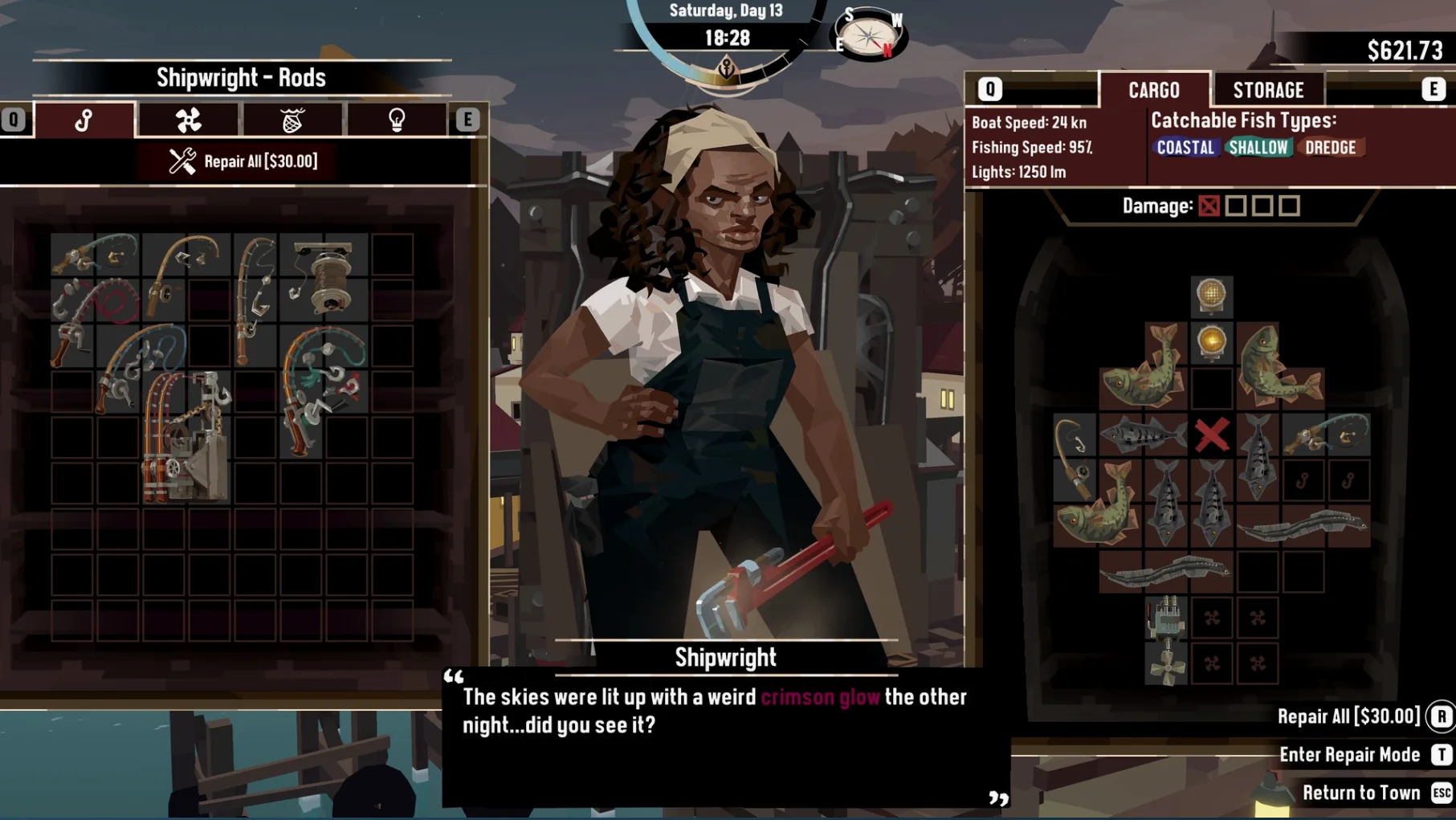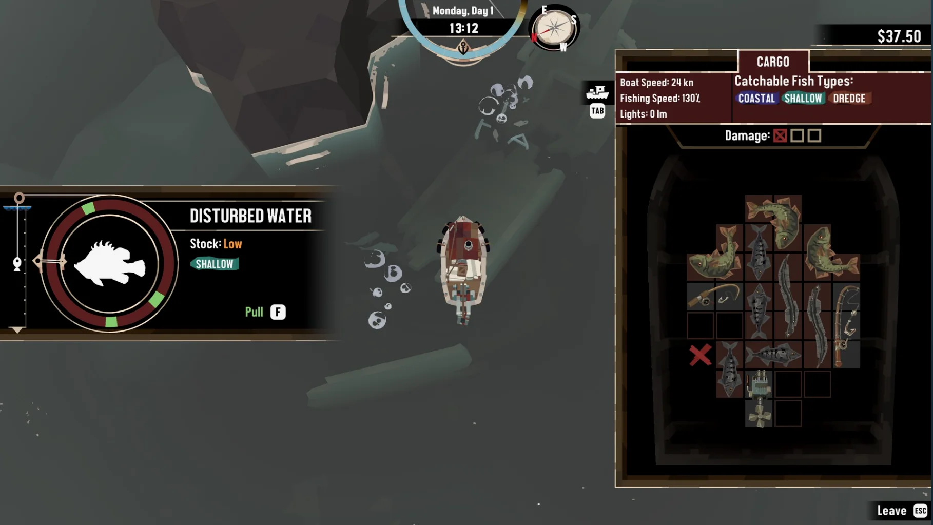 在《渔帆暗涌》中,背包并不是以负重的形式体现,而是被加入了「背包管理」机制,这点其实在近些年的游戏也出现了不少次。然而本作有趣的一点在于,对于船只的升级是会体现到背包管理之中,像是灯具、引擎、钓具这些船用装置都会占据背包格子,同时只能安排在固定位置,这进一步放大了本作的策略思考。如果你驾驶技术并不过关,对船只的损耗会直接作用于你放在相应位置的物品上,因此那些珍惜鱼种都得尽量放到背包中央保护起来。总的来说,基础的鱼类放置已经需要玩家通过旋转来找到一个最佳位置,而把船用设施加入背包管理以后大大提高了游戏策略性,也变相增加了游戏难度,让你在驾驶过程中更加小心谨慎。