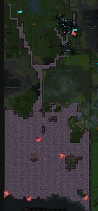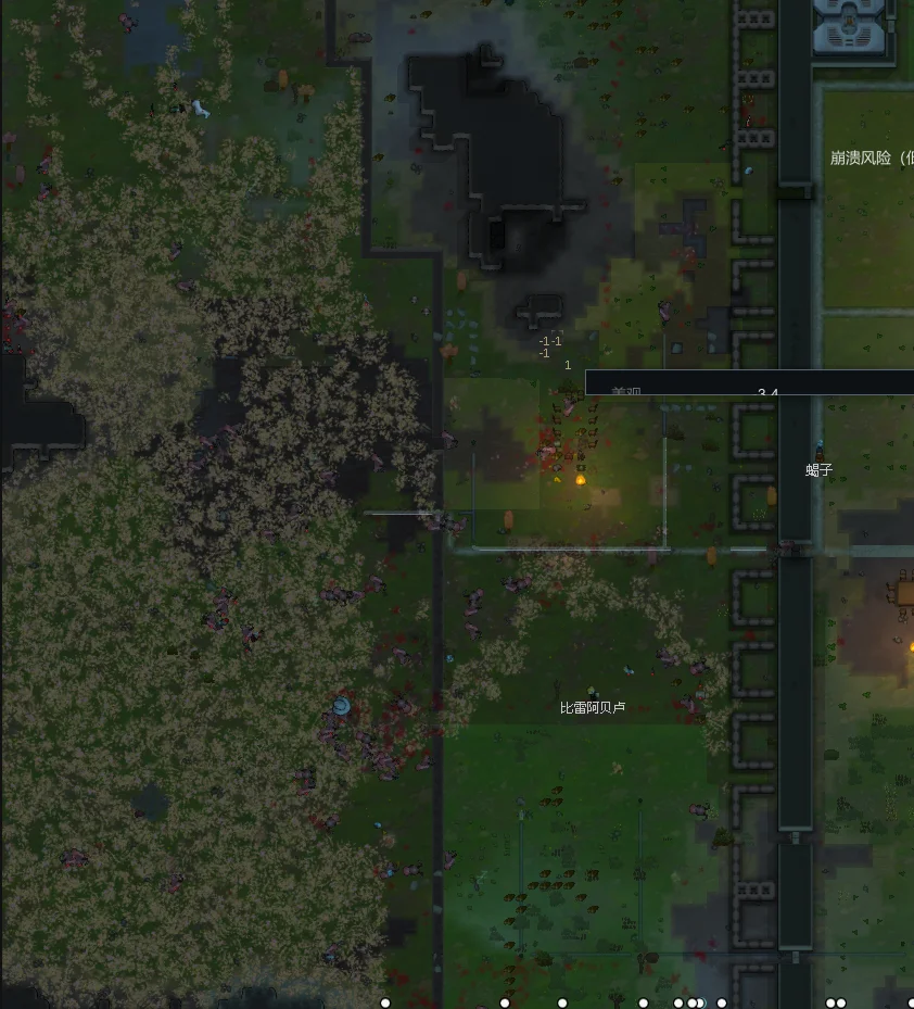 图二与图四:危急时刻,文明外来者盟友来了!太好啦!说真的,如果没有盟友帮我分摊,那么我得需要一班五人一共三班战斗小组轮班倒才能控制局势,而且还得拆出机动力量来处理突破防线突入生活生产区域的血肉兽。建议战斗小组编入食尸鬼以及近战单位,远程战斗单位建议站成一排齐射。另外一个重要建议是使用迫击炮、多管火箭炮、榴弹炮和岸防炮炮兵提供火力支援以打掉血肉连接处或者酸液喷吐血肉袋。自己当然的了:让你的机械体离天灾远点。
