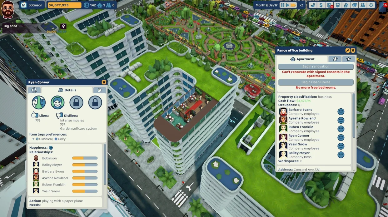 一种是整蛊租客,一种是兢兢业业的当名好房东。这样的游戏思路,体现在“技能树”系统。游戏中玩家可以通过任务获取经验,购买公寓并租赁给客户来实现等级提升,等级提升可以解锁新物品,也可以获得积分。而积分可以解锁技能树上的三个主要分支:租户,提升租户满意度或整蛊租户;房东,提升续租时间或租房效率;叔叔,主要要是提升维修成功率和解决问题的时间(以及提升满意度)。