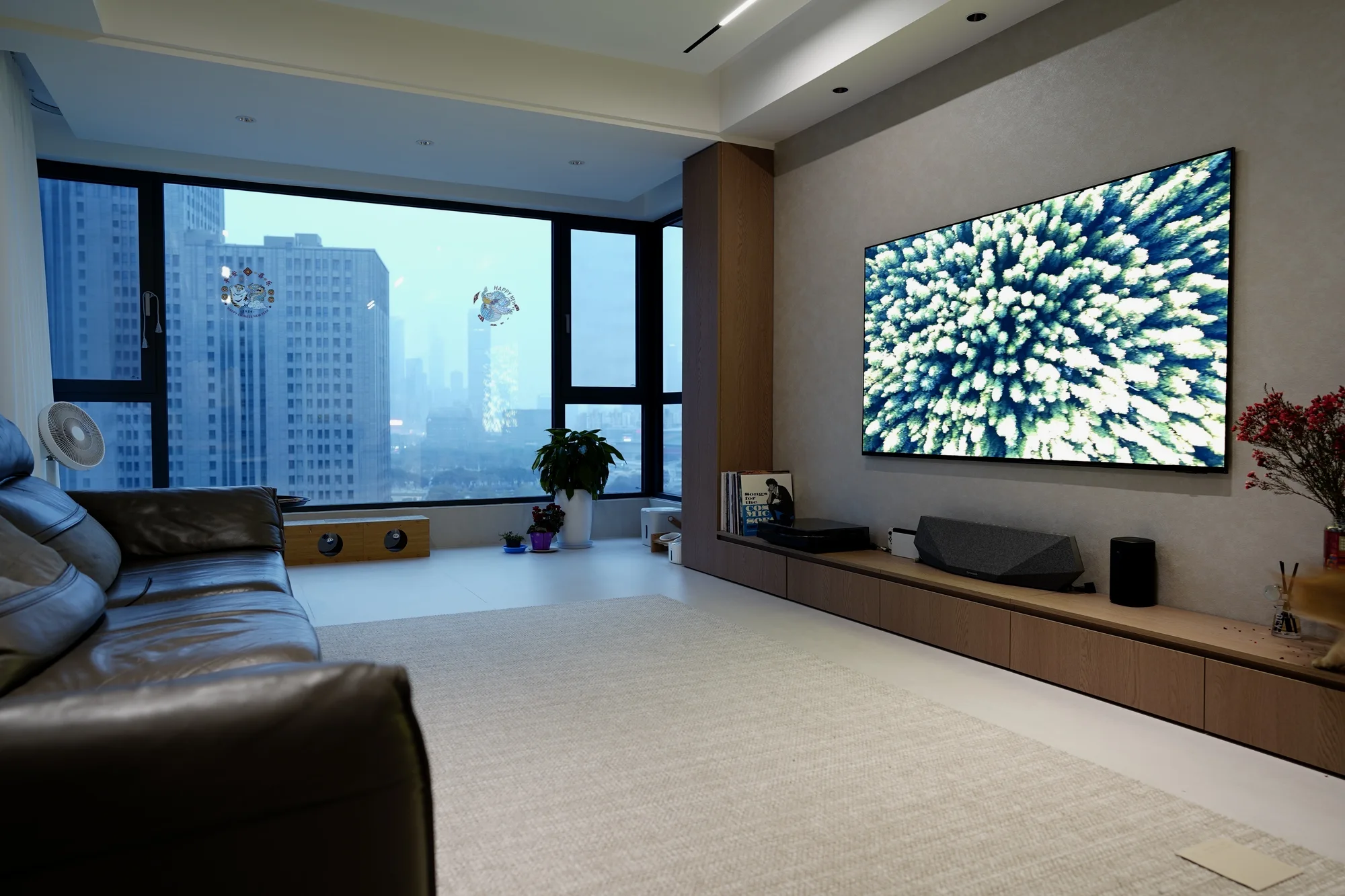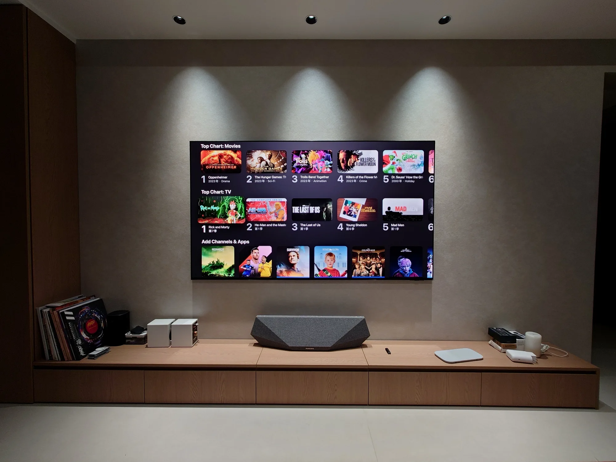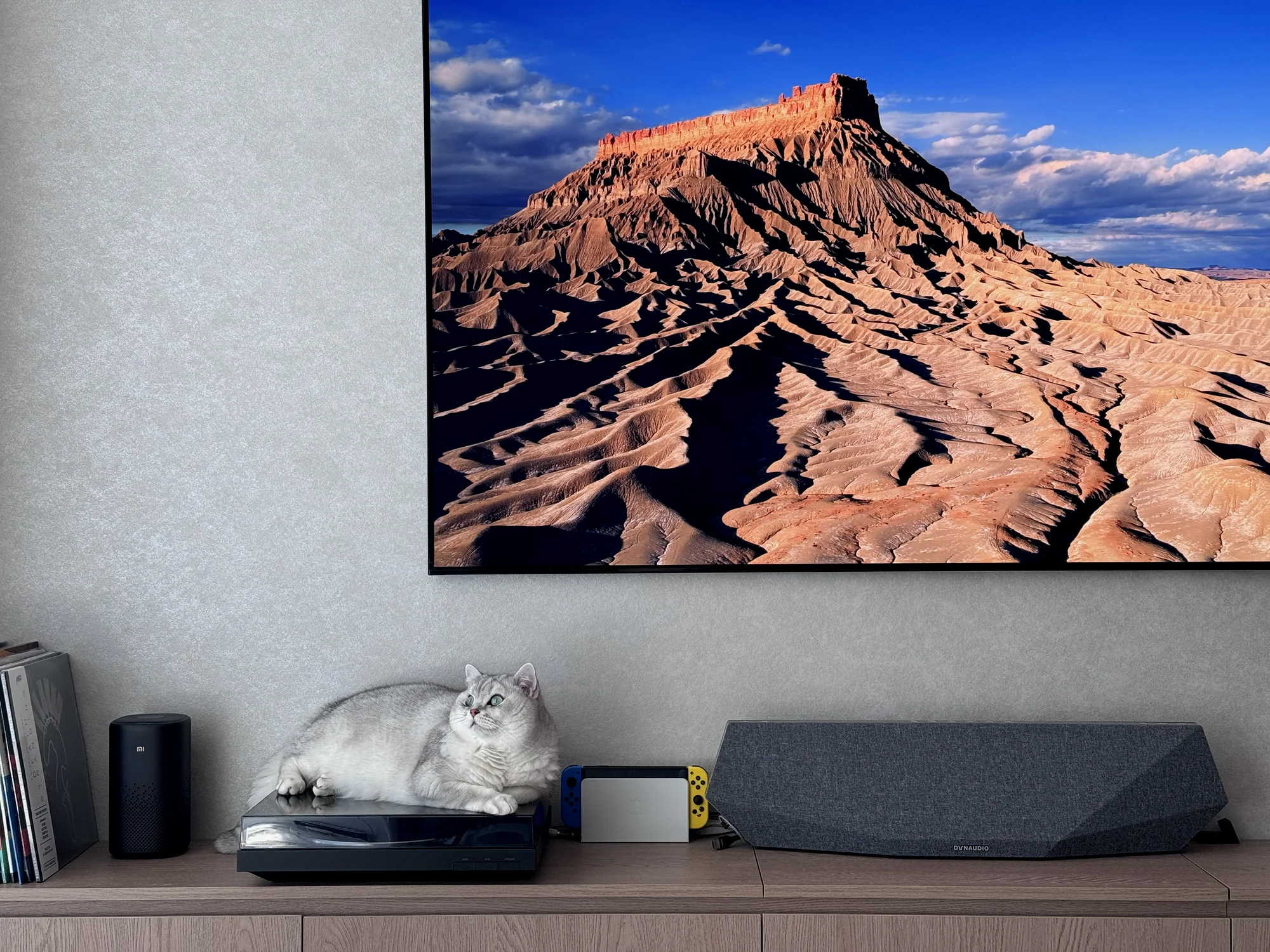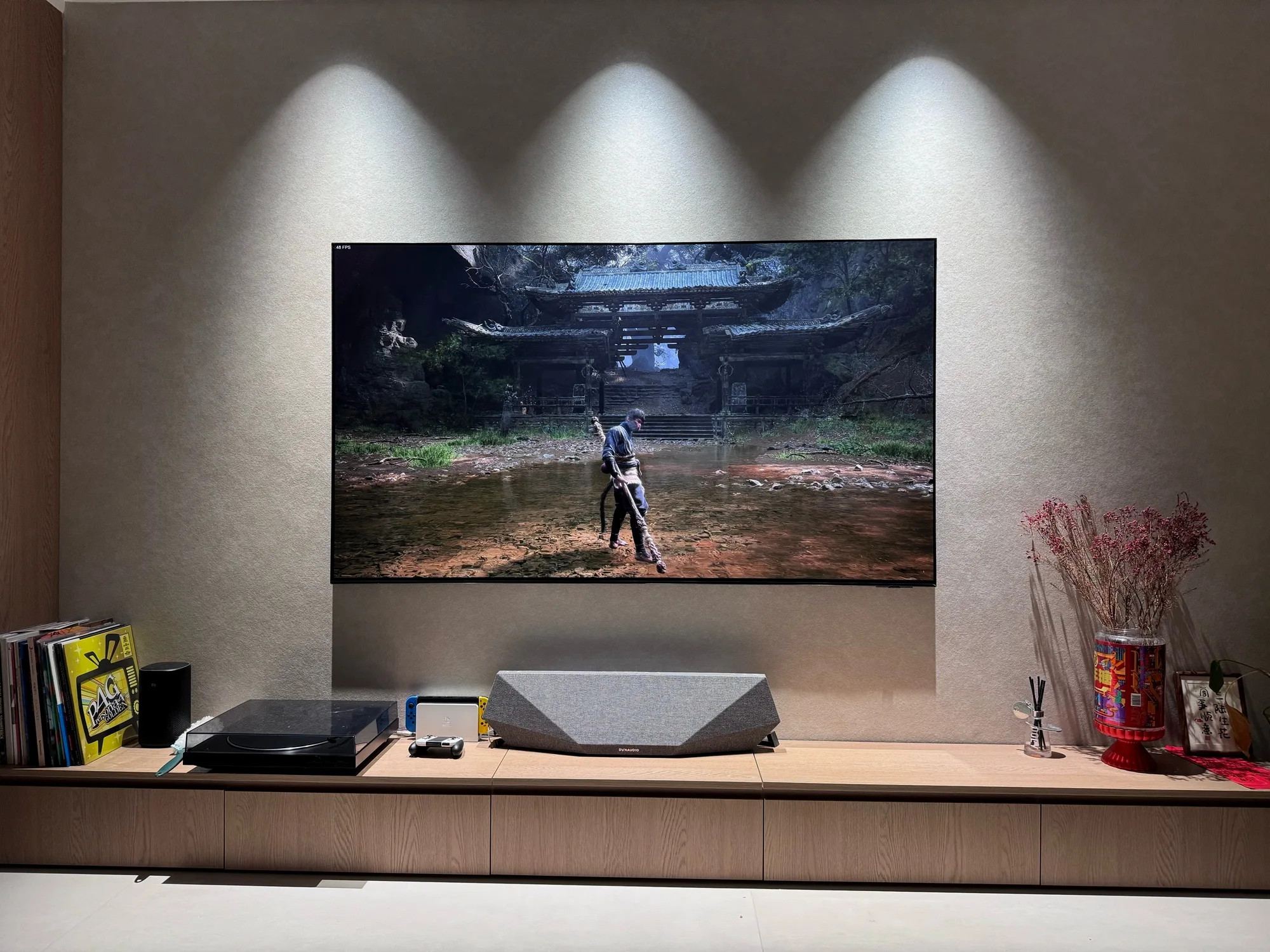 产品是 三星的 77 寸 S95Z 算是去年的旗舰,选择三星的产品主要原因是与 Sony 去年的旗舰具有巨大的价格优势,同时主机与屏幕分离的设计,让屏幕能紧贴墙壁 视觉体验非常舒适