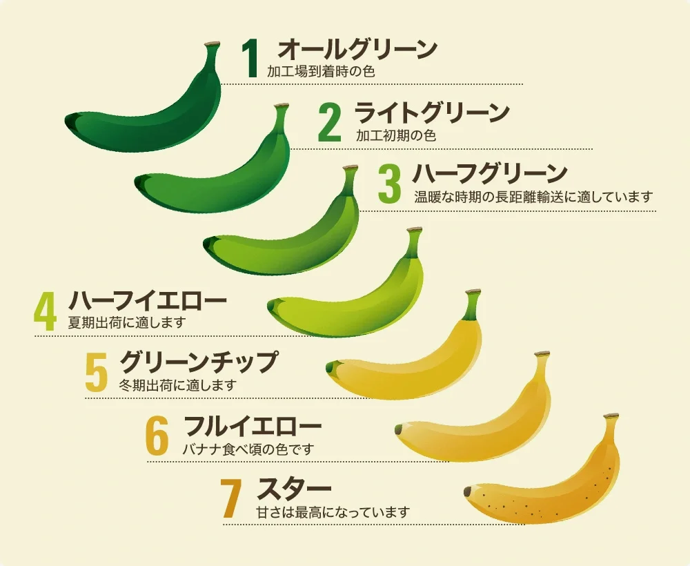 附上一张熟度参考图,来自香蕉专业户 dole 的网站,翻译大致如下: