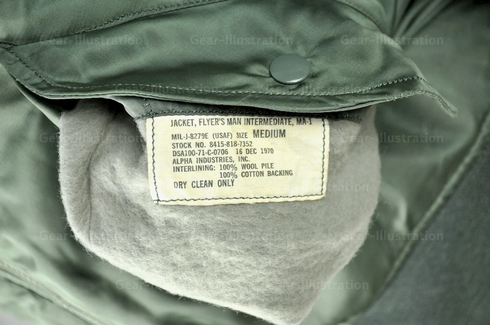 MA-1飞行版型其实来自二战和五十年代B-15轰炸机夹克,军版标准号MIL-J-8279,历经过多个版本。MA-1的早期版本,包括我手头这件,内衬为羊毛毡,重量非常可观。