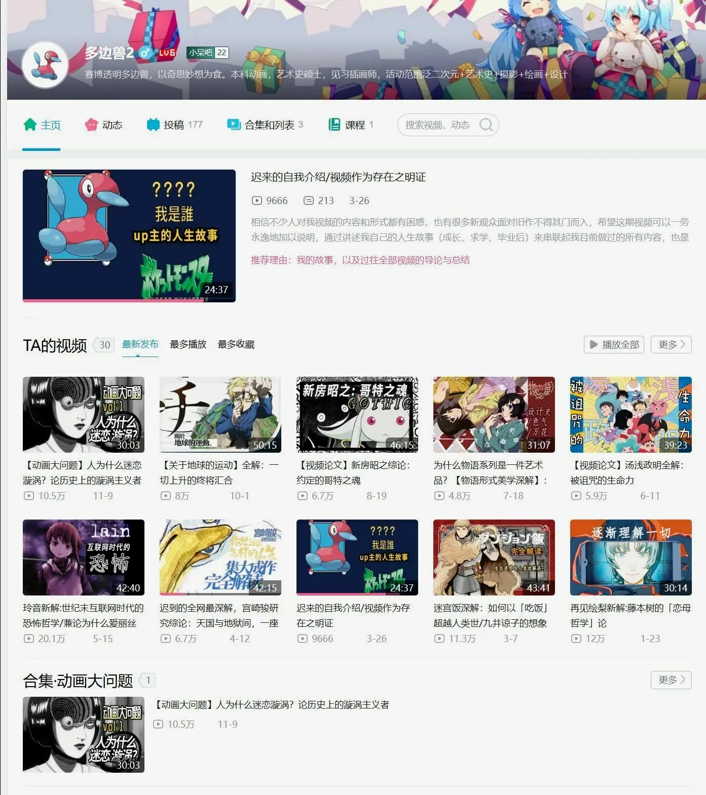 多边兽2大佬刚接触不久,被宫崎骏和漩涡那两集的深度惊呆,在他的描述下感到艺术家创作的动机不仅是私人的,背后还有艺术史无形的手的推动,也像荣格的集体无意识。可遇见的会吃很多作品的安利(已经在看漂流少年了)。